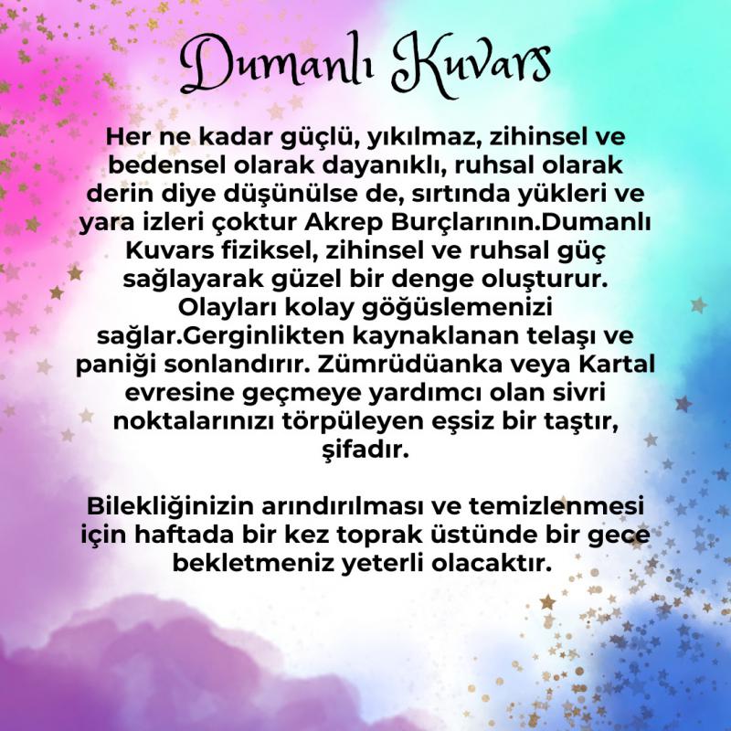 - Dumanlı Kuvars fiziksel, zihinsel ve ruhsal güç sağlayarak güzel bir denge oluşturur. Olayları kolay göğüslemenizi sağlar.