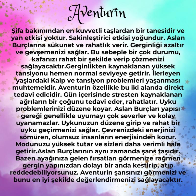 - Aslan Burçlarının aynı zamanda şans taşıdır. Bazen ayağınıza gelen fırsatları görmenize rağmen gergin yapınızdan dolayı bir anda kestirip, atıp reddedebiliyorsunuz. Aventurin şansınızı görmenizi ve bunu en iyi şekilde değerlendirmenizi sağlayacaktır.