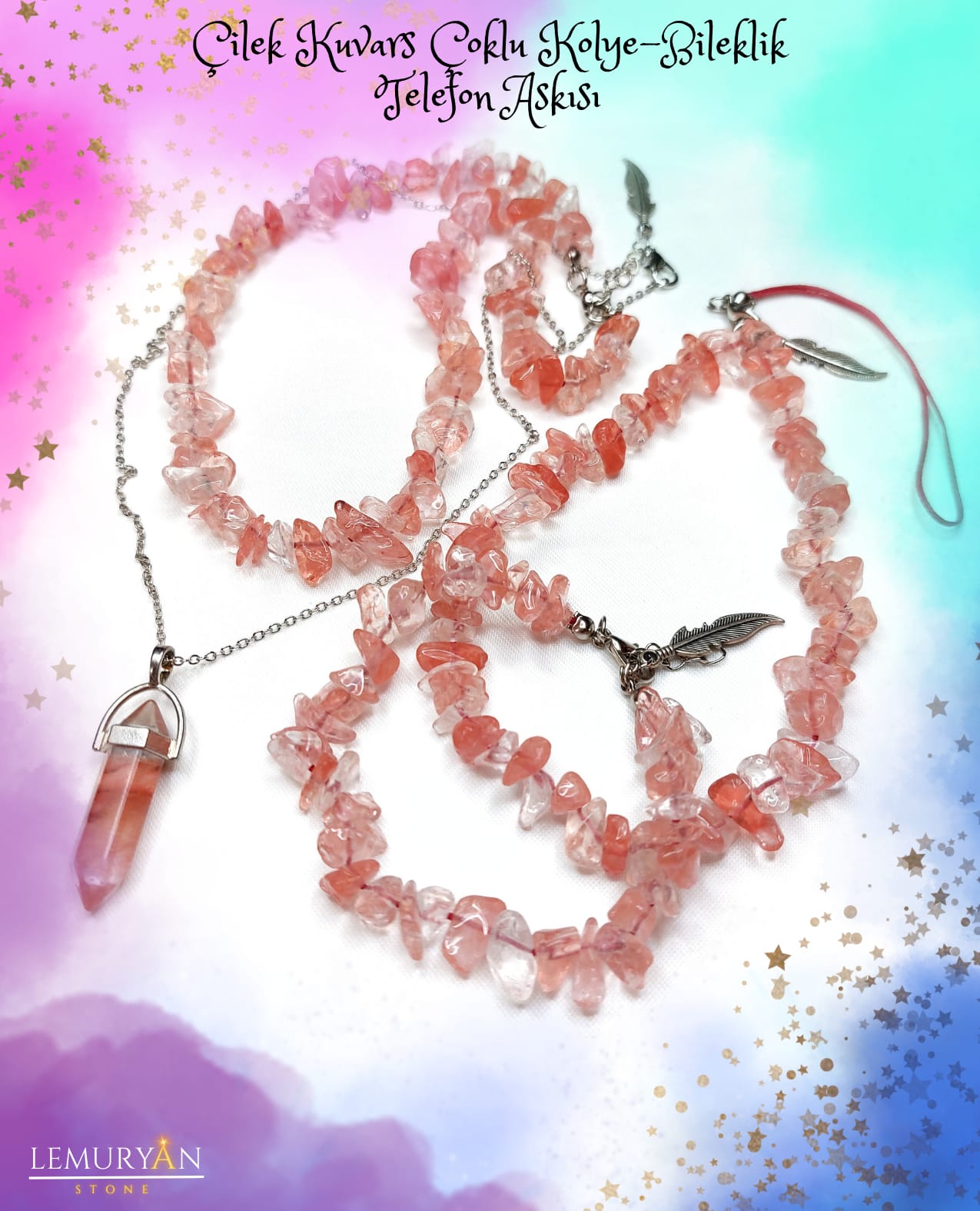 Çilek Kuvars Çoklu Kolye & Bileklik ve Telefon Askısı
